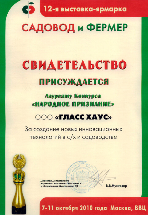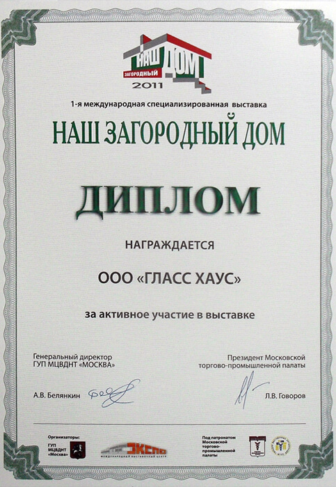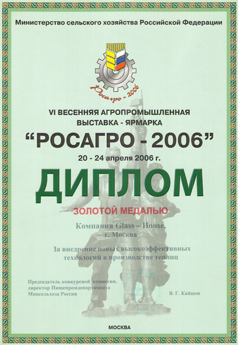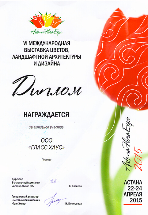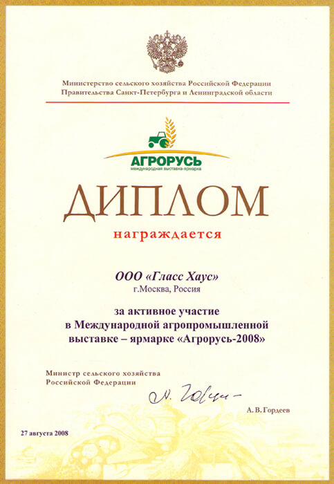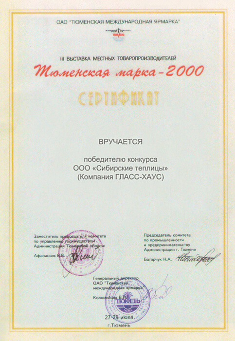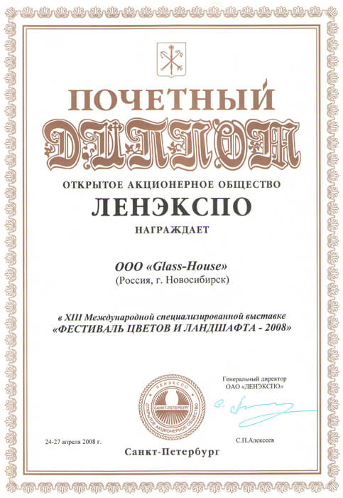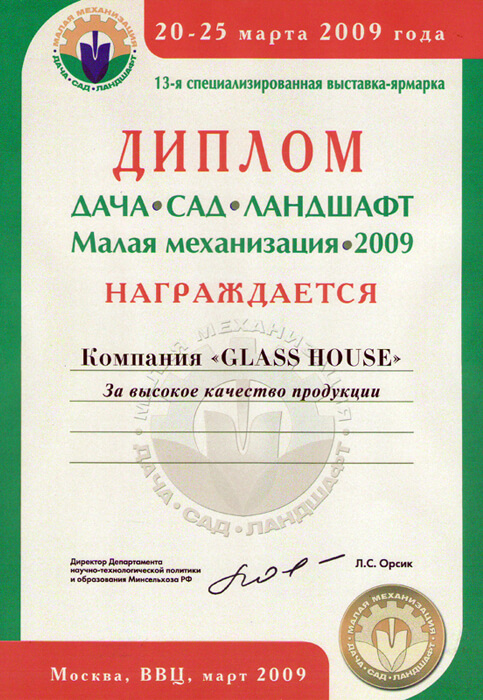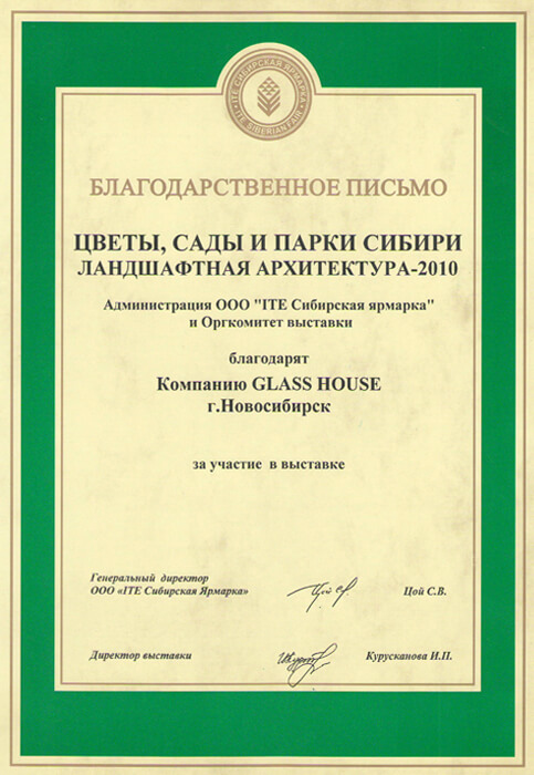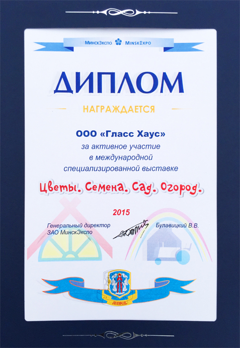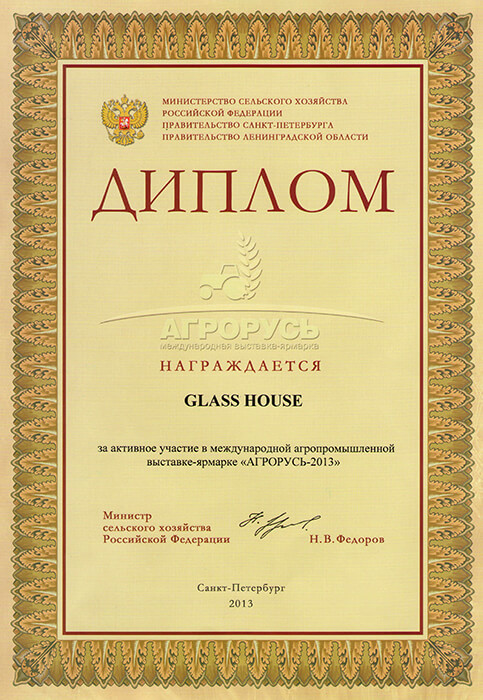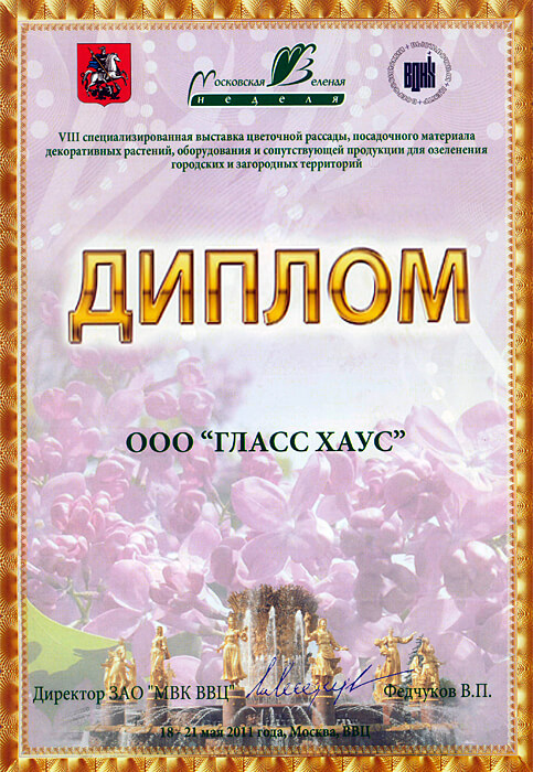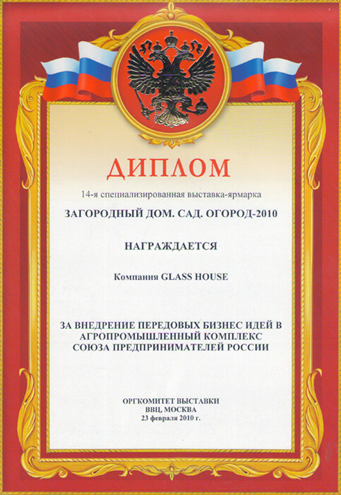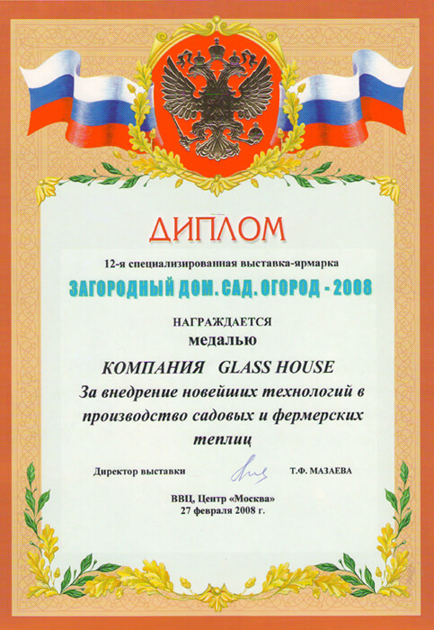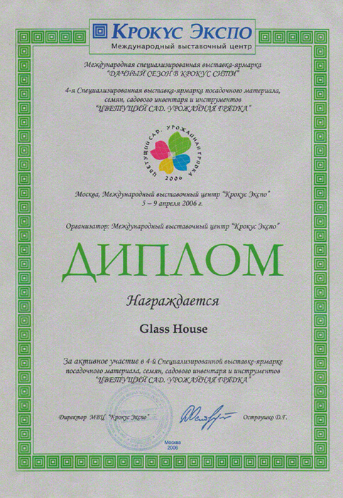 Первая выставка, где была представлена продукция GLASS HOUSE, прошла в Тюмени в 2000 году! С этого времени коллекция компании пополнилась дипломами и сертификатами с многочисленных выставок и форумов с высокой оценкой качества наших теплиц!