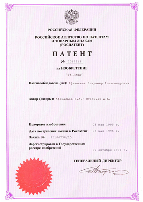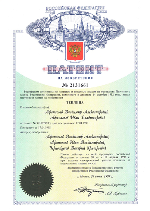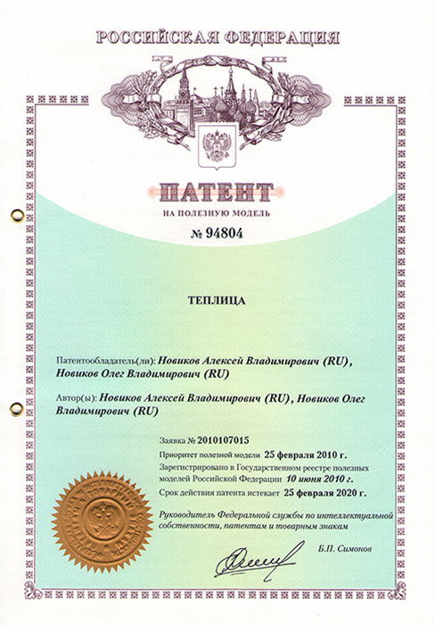 Получены первые патенты на уникальные конструктивные элементы теплиц.