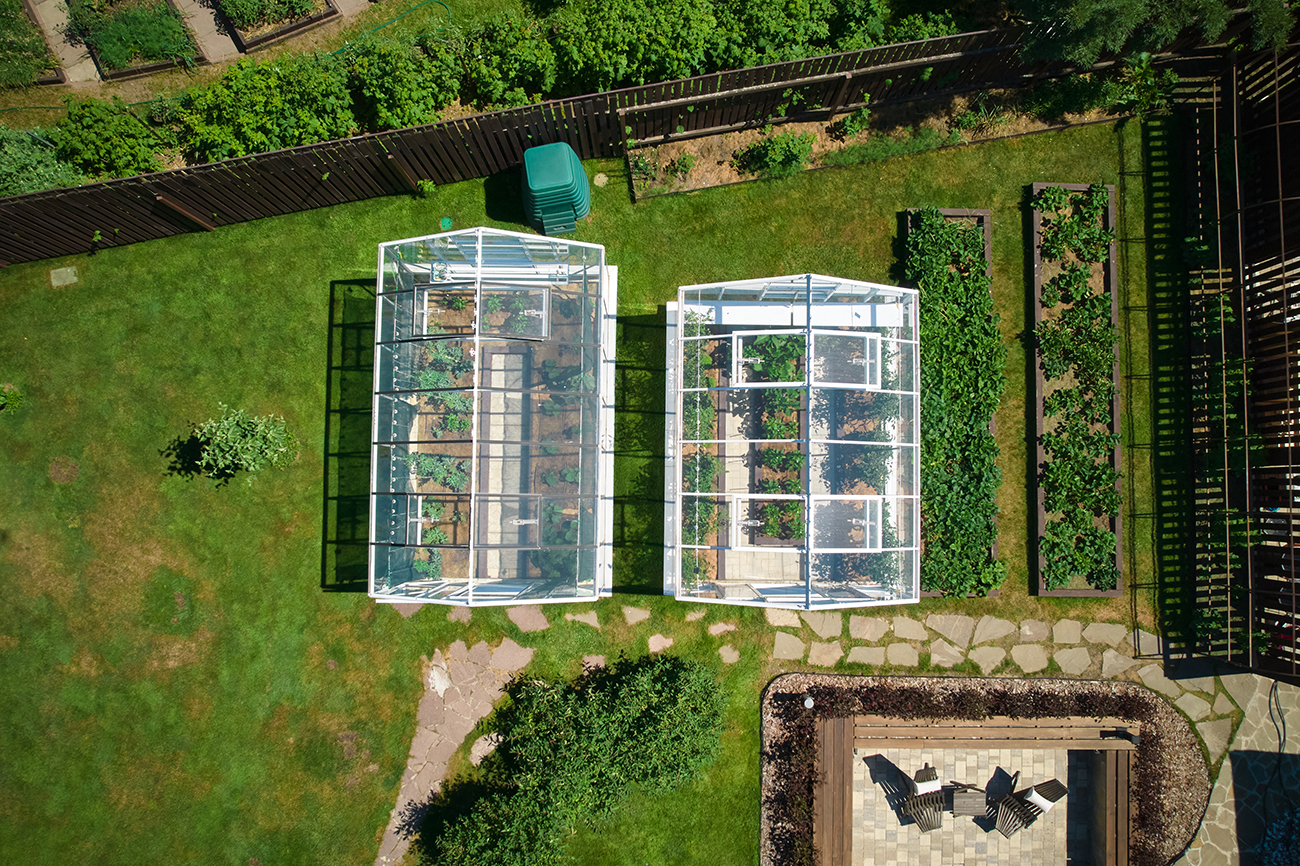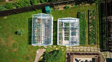 Две теплицы на одном участке – продуманное решение с акцентом на симметрию и архитектурный баланс. Композиция формирует цельное пространство, где каждая конструкция дополняет другую, создавая гармоничный и выразительный облик участка.