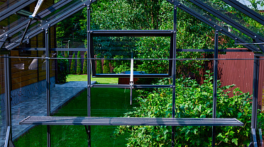 Компактный формат с акцентом на удобство размещения и продуманную организацию пространства. Графитовый оттенок придаёт конструкции более строгий и архитектурный характер, делая её выразительным и аккуратным элементом участка.