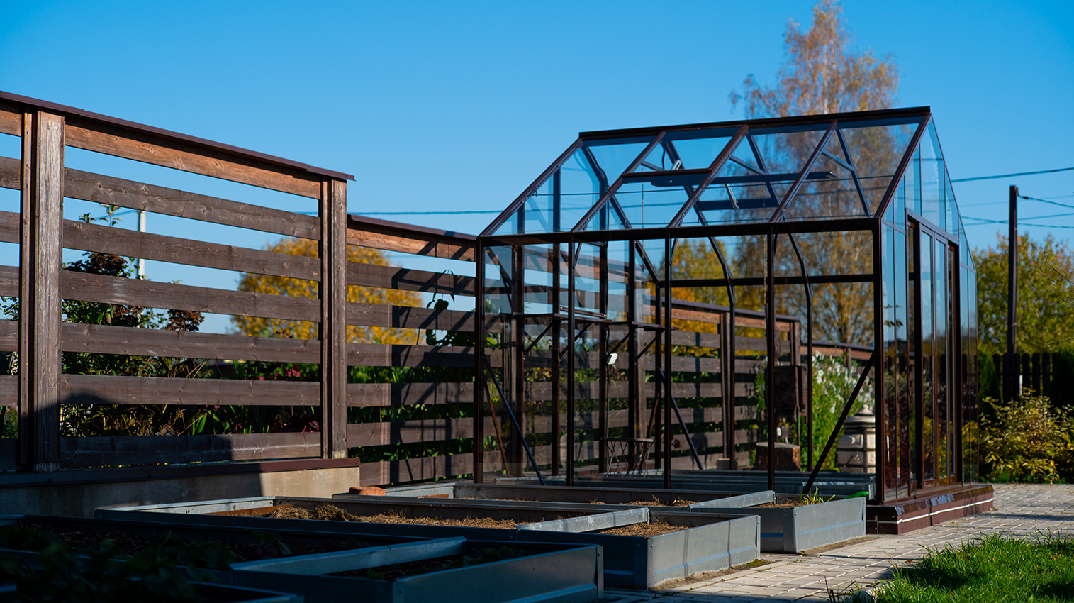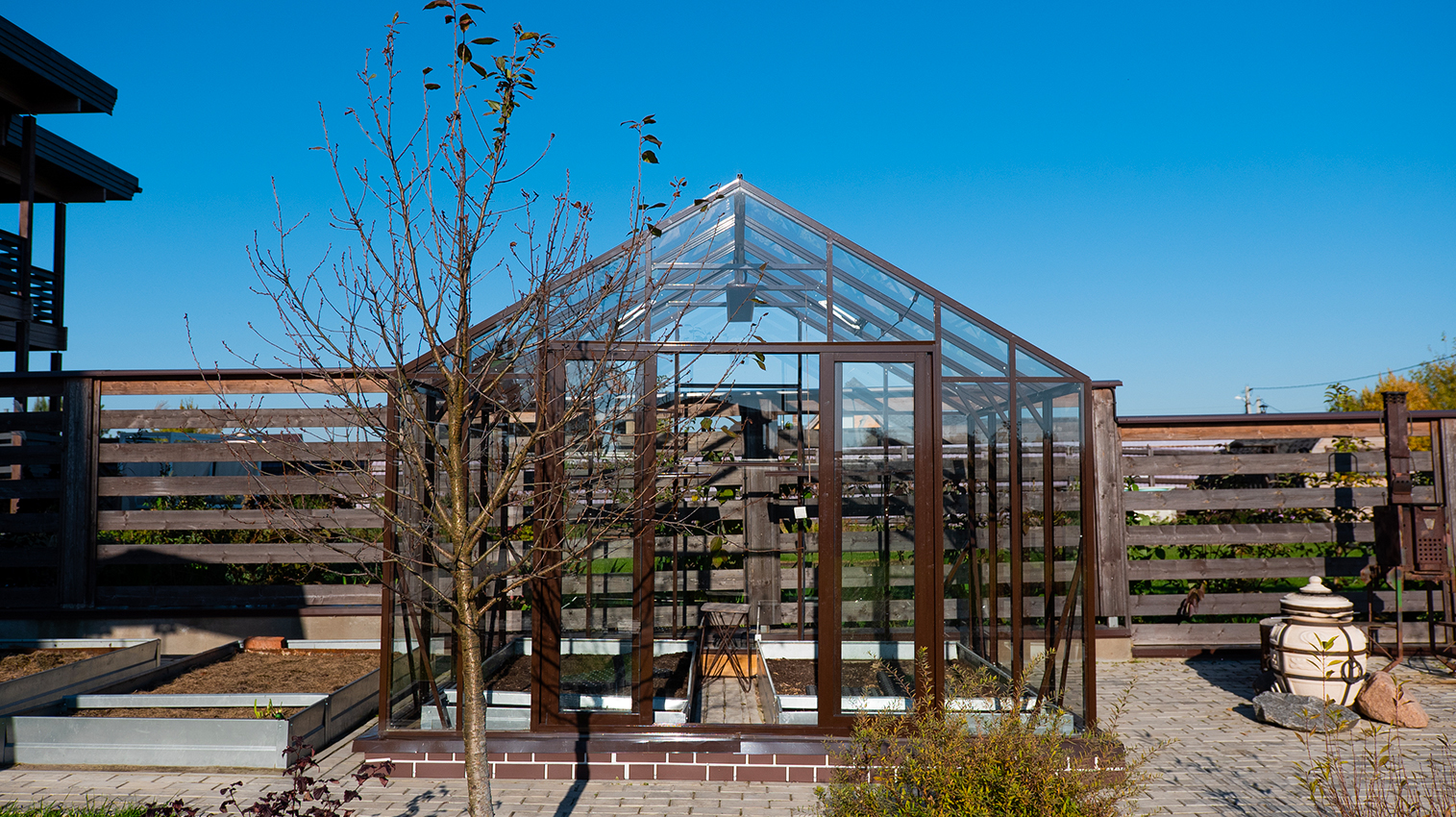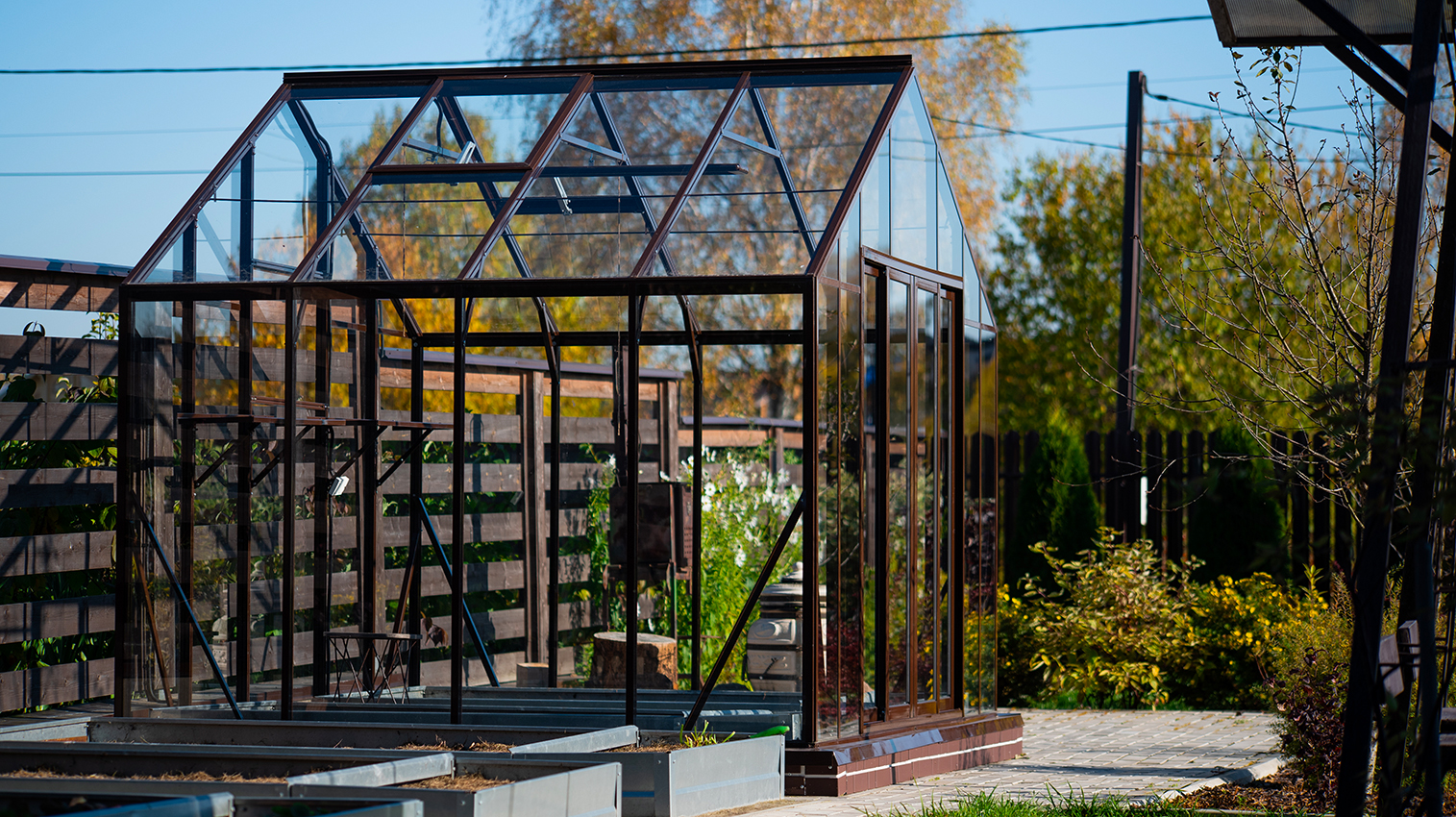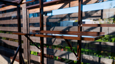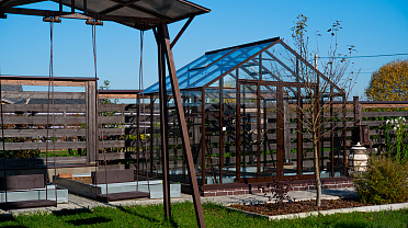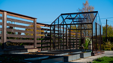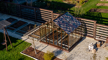Тёплый коричневый оттенок формирует более мягкое и уютное восприятие, органично связывая теплицу с ландшафтом. Сдержанная архитектура и чистые линии создают аккуратный акцент на участке, сохраняя баланс между выразительностью и естественностью.
