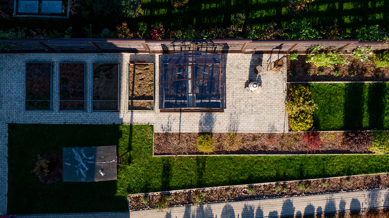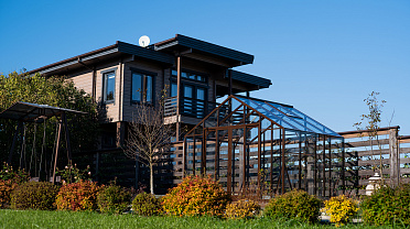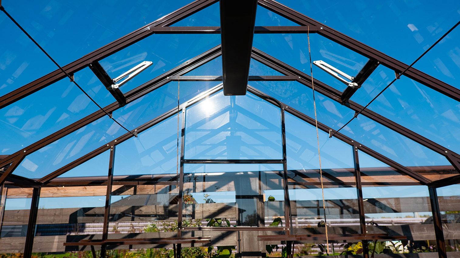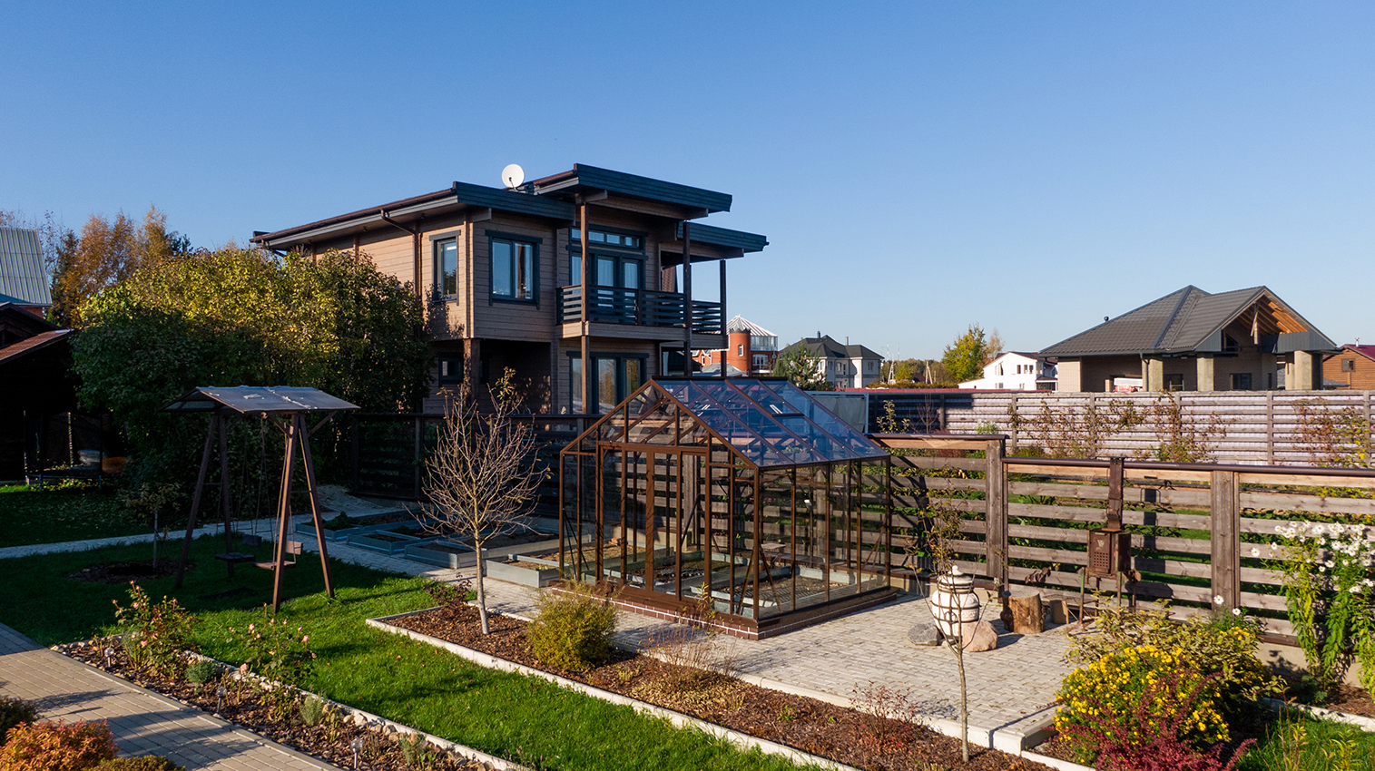 Тёплый коричневый оттенок формирует более мягкое и уютное восприятие, органично связывая теплицу с ландшафтом. Сдержанная архитектура и чистые линии создают аккуратный акцент на участке, сохраняя баланс между выразительностью и естественностью.