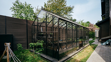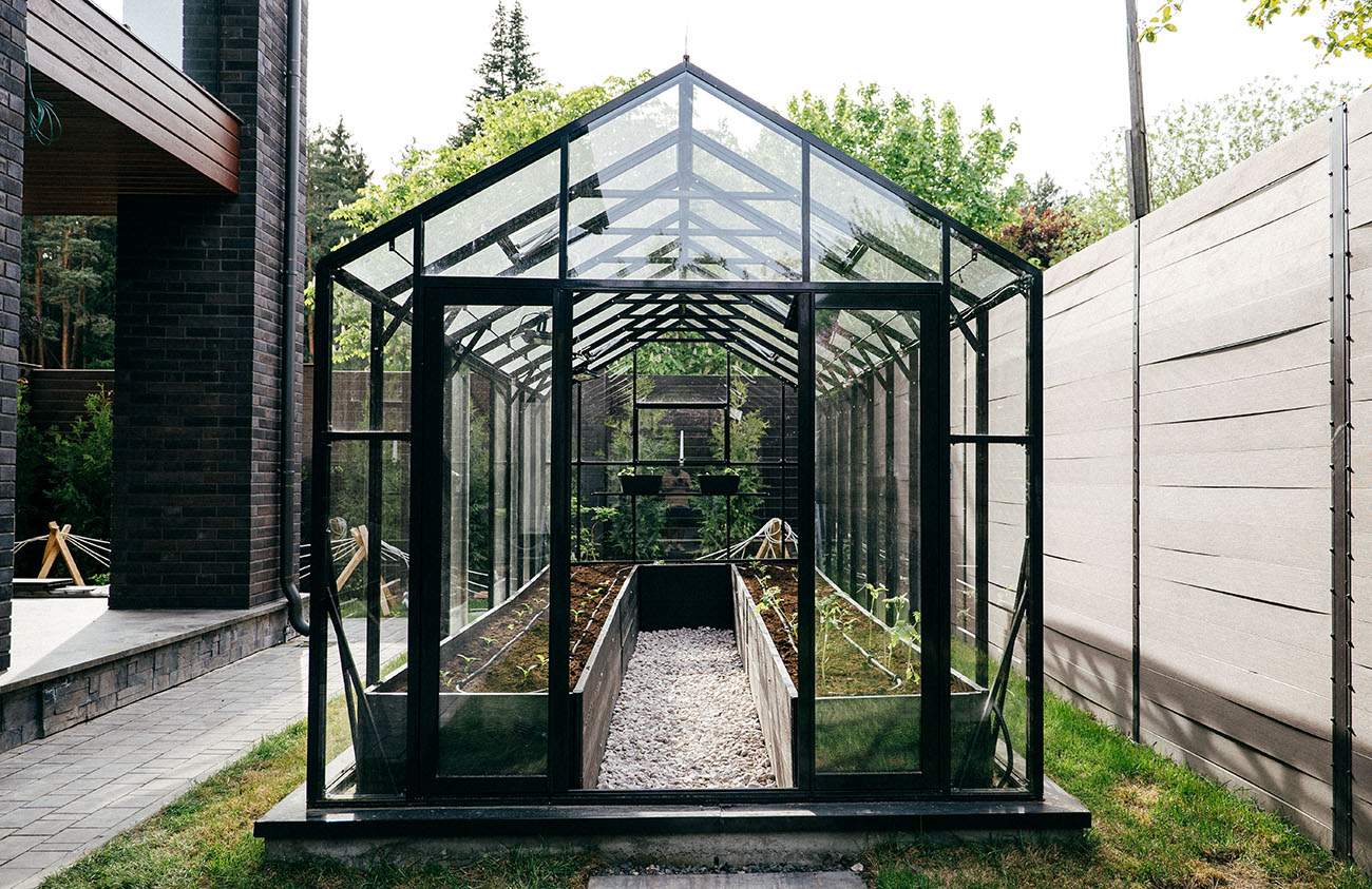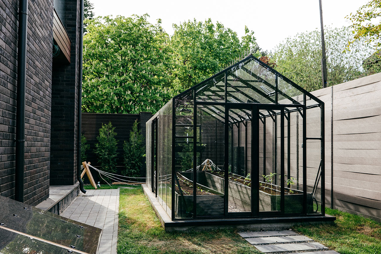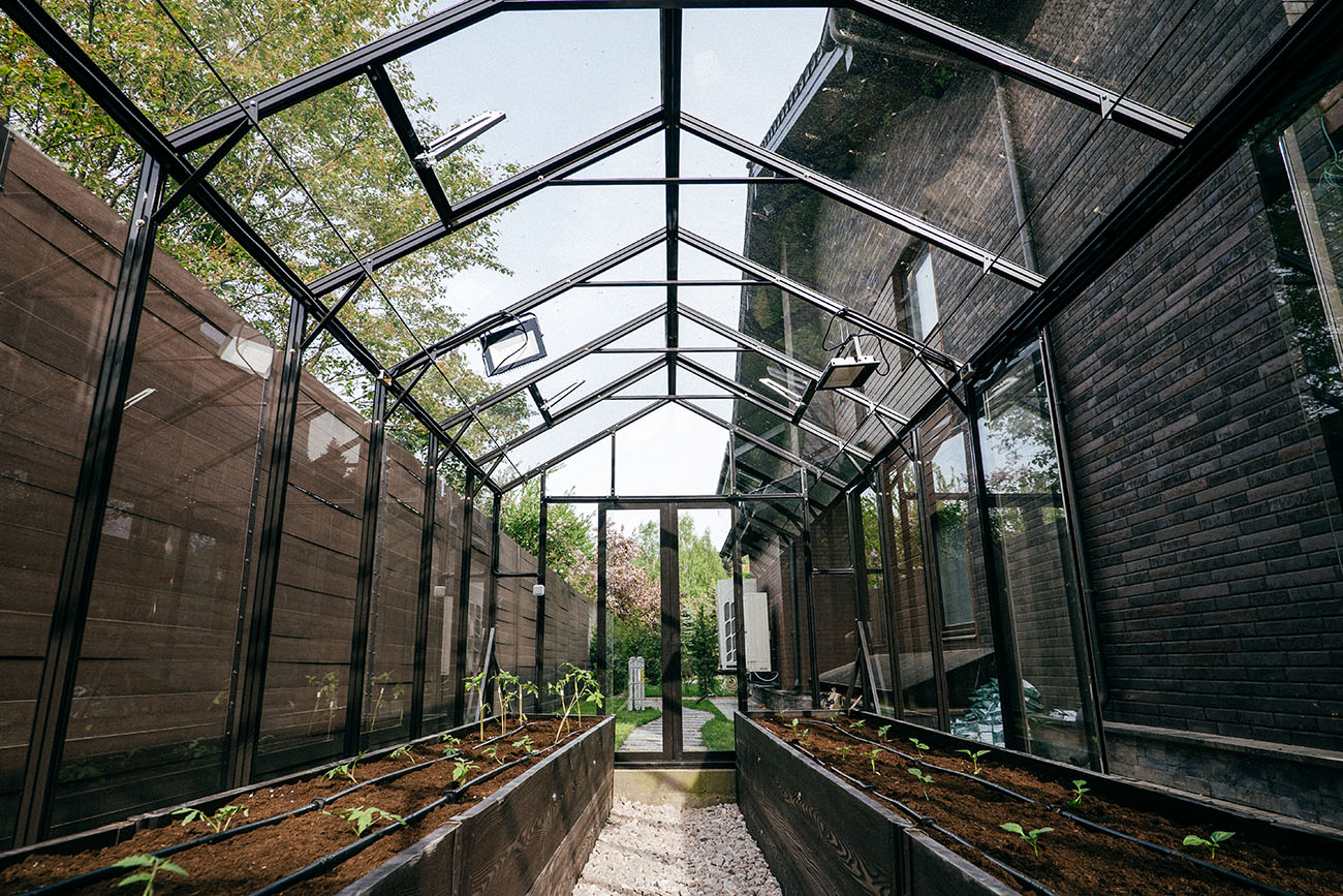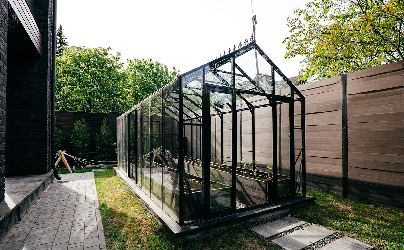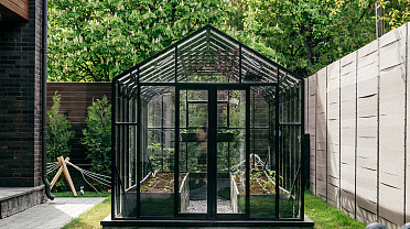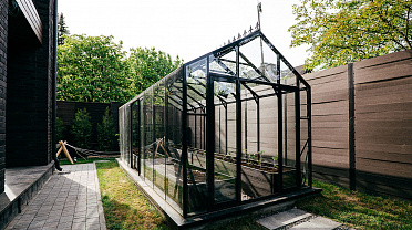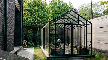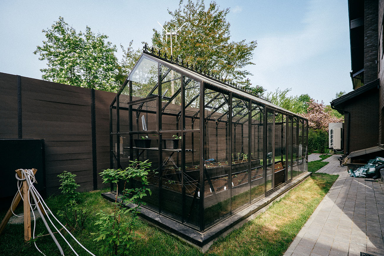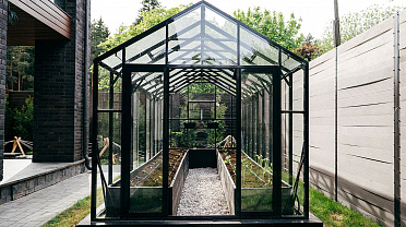 Теплица БИОНИКА Комфорт с боковым входом на участке Ольги Орловой – сочетание архитектурной эстетики и продуманной функциональности. Конструкция из стекла и алюминия органично вписалась в пространство, сохранив лёгкость и аккуратную геометрию, а боковой вход делает использование теплицы максимально удобным.