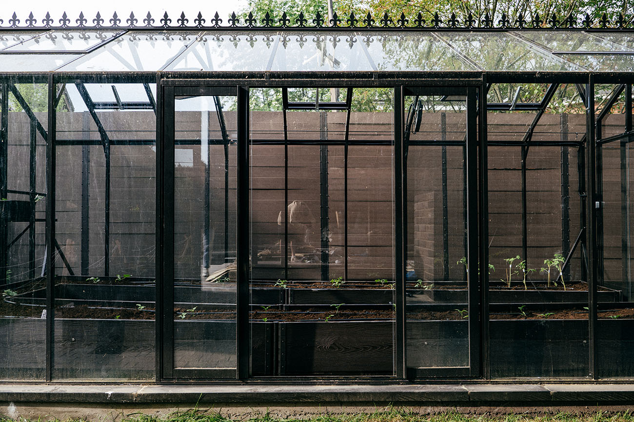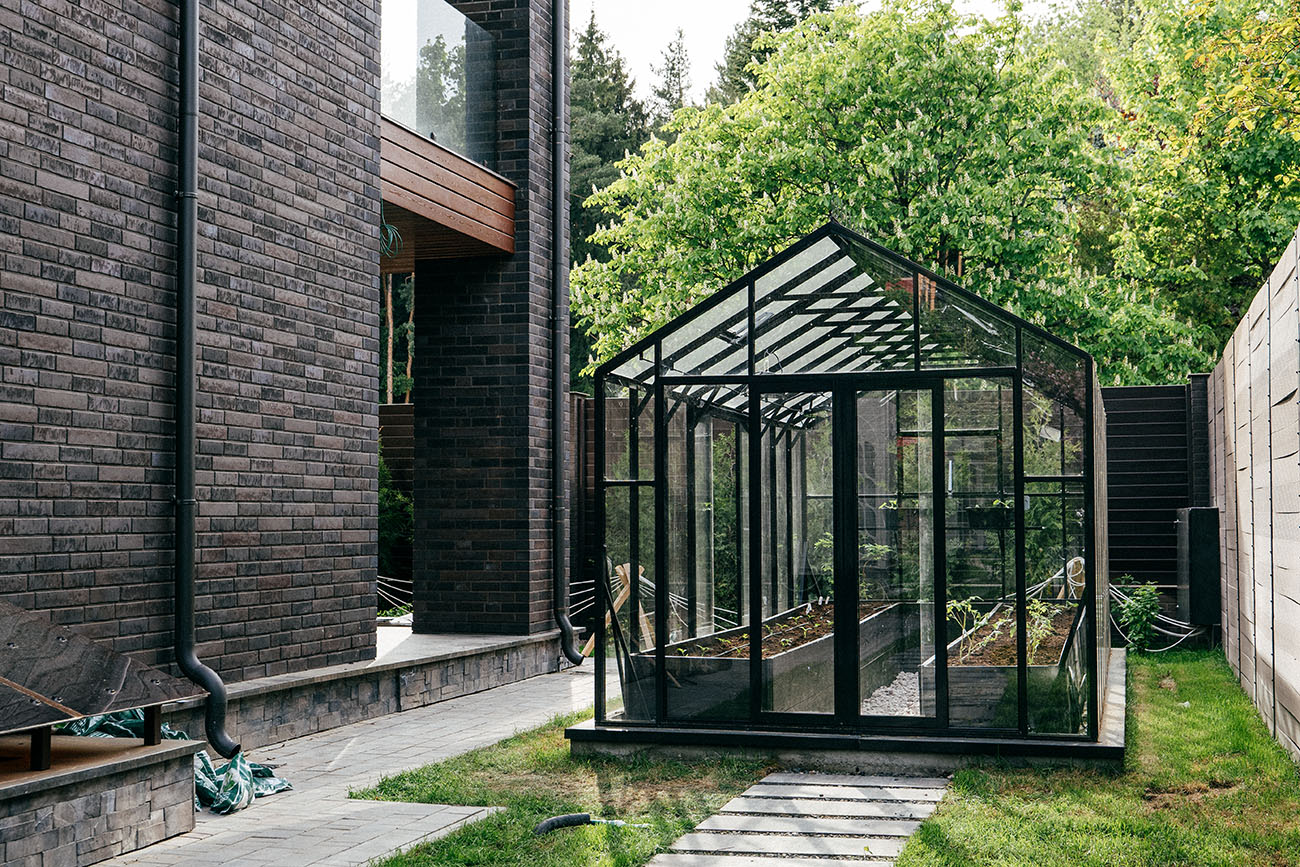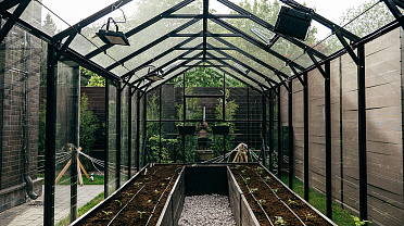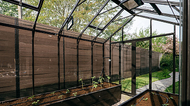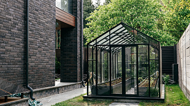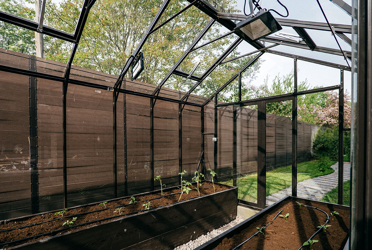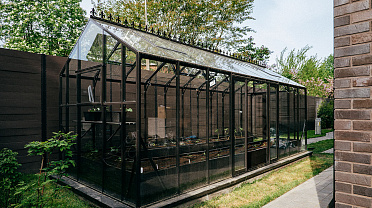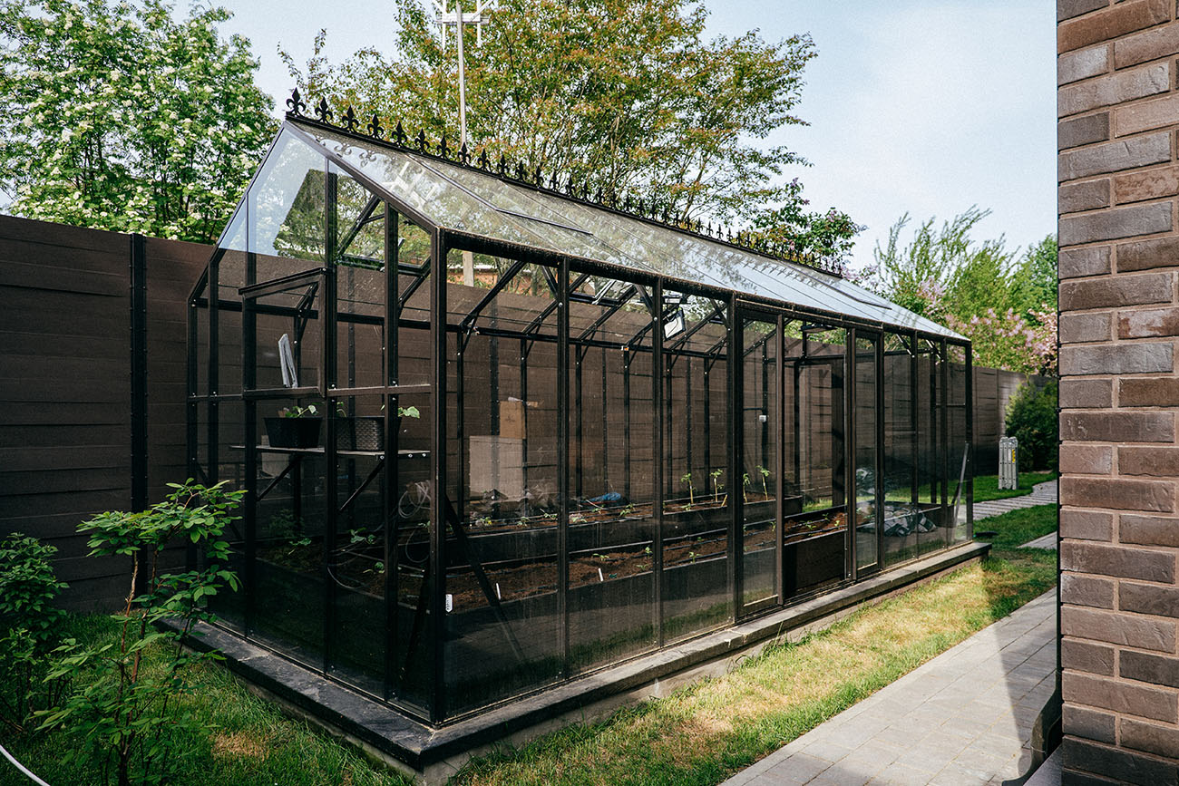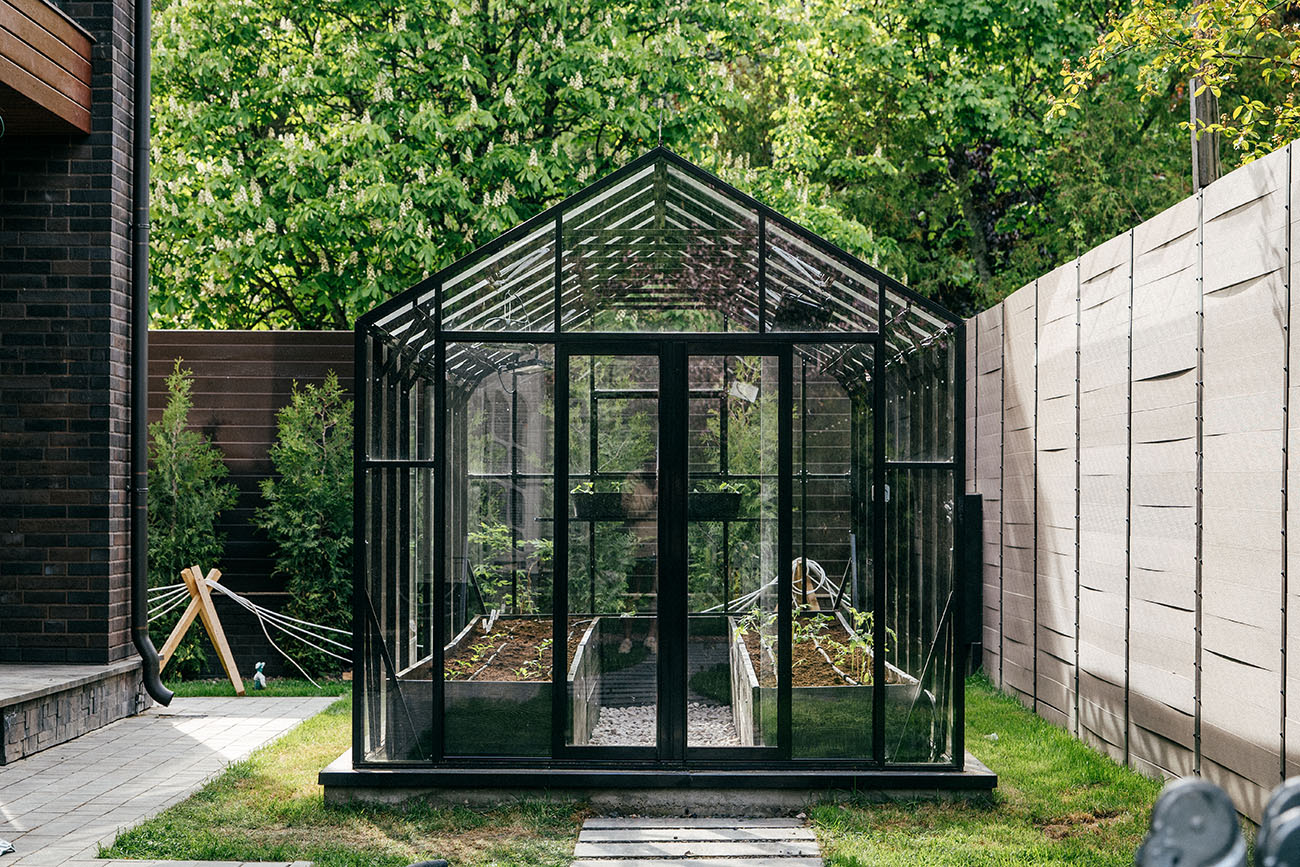 Теплица БИОНИКА Комфорт с боковым входом на участке Ольги Орловой – сочетание архитектурной эстетики и продуманной функциональности. Конструкция из стекла и алюминия органично вписалась в пространство, сохранив лёгкость и аккуратную геометрию, а боковой вход делает использование теплицы максимально удобным.