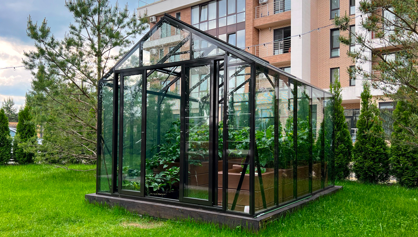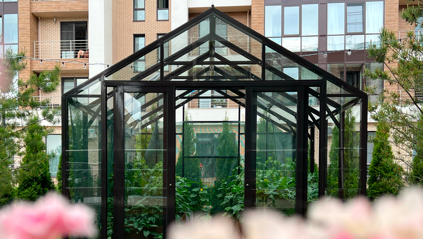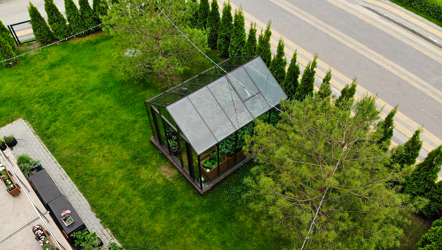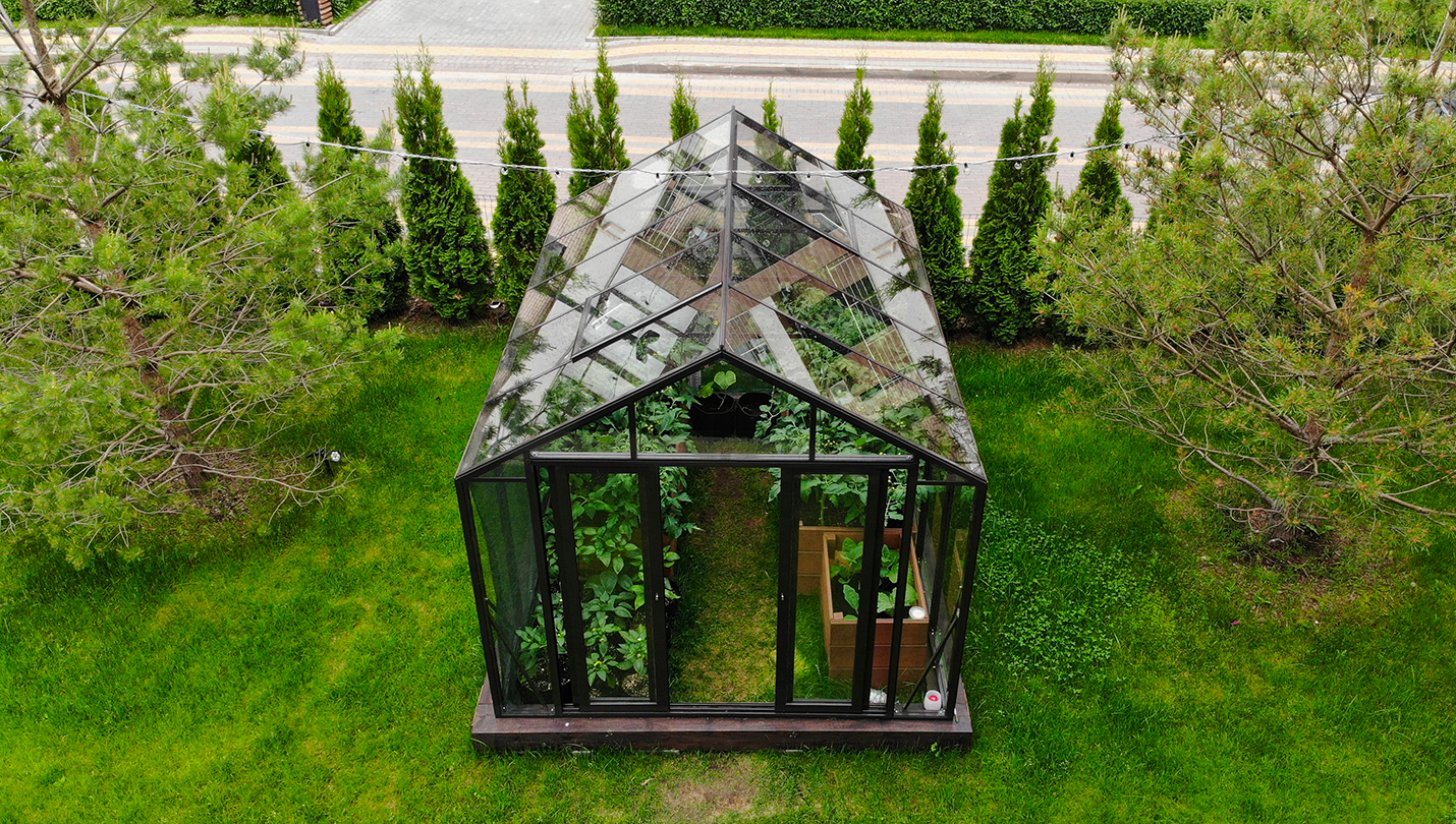 Решение для небольшого участка рядом с таунхаусом с акцентом на компактность и аккуратную интеграцию. Теплица органично вписывается в пространство, сохраняя лёгкость восприятия и создавая удобную зону для выращивания.