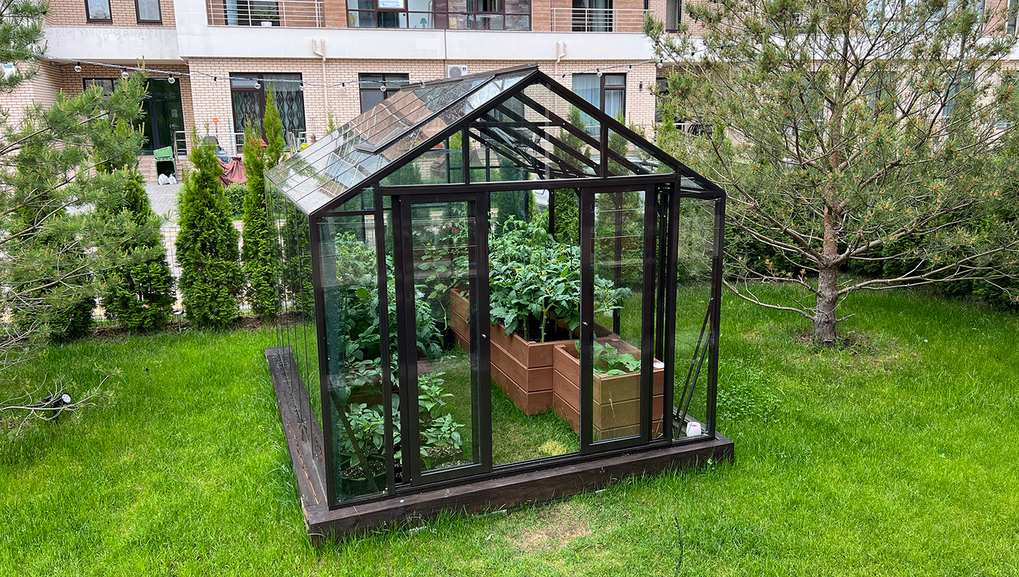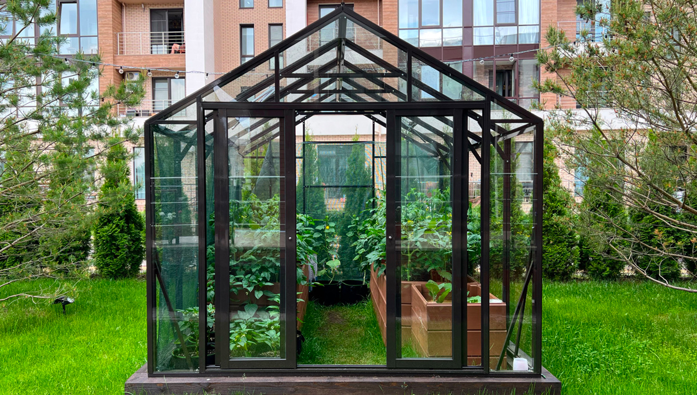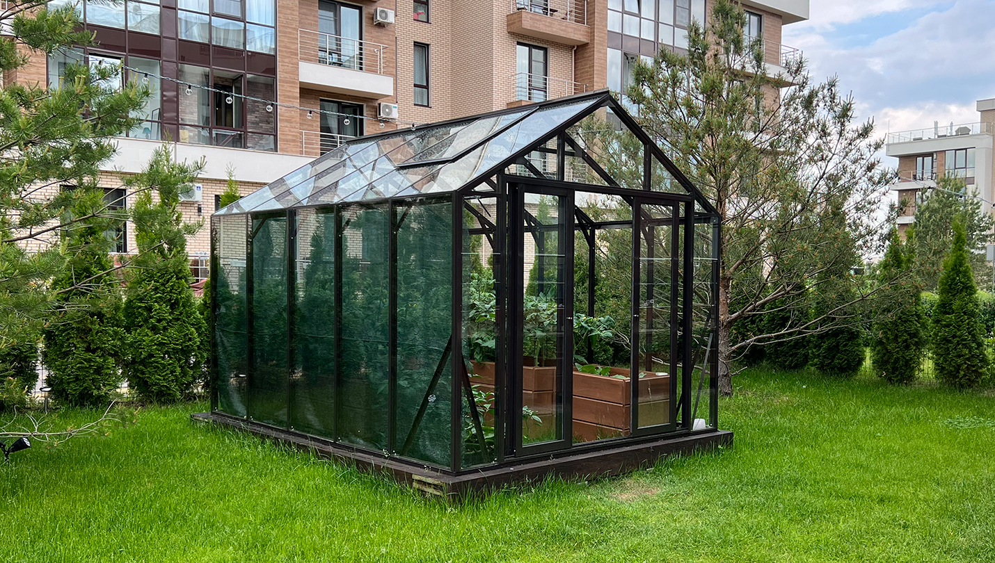Решение для небольшого участка рядом с таунхаусом с акцентом на компактность и аккуратную интеграцию. Теплица органично вписывается в пространство, сохраняя лёгкость восприятия и создавая удобную зону для выращивания.