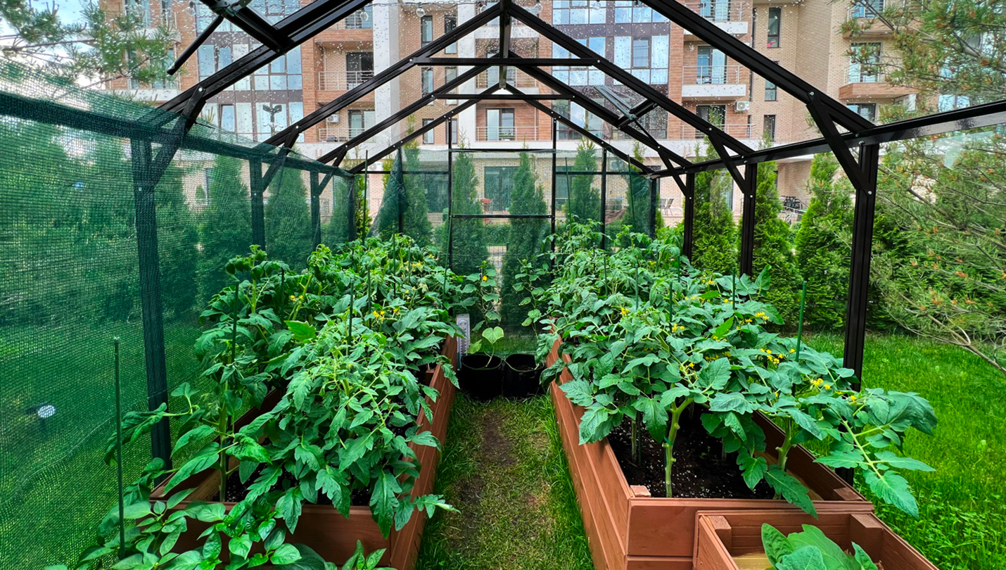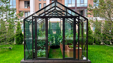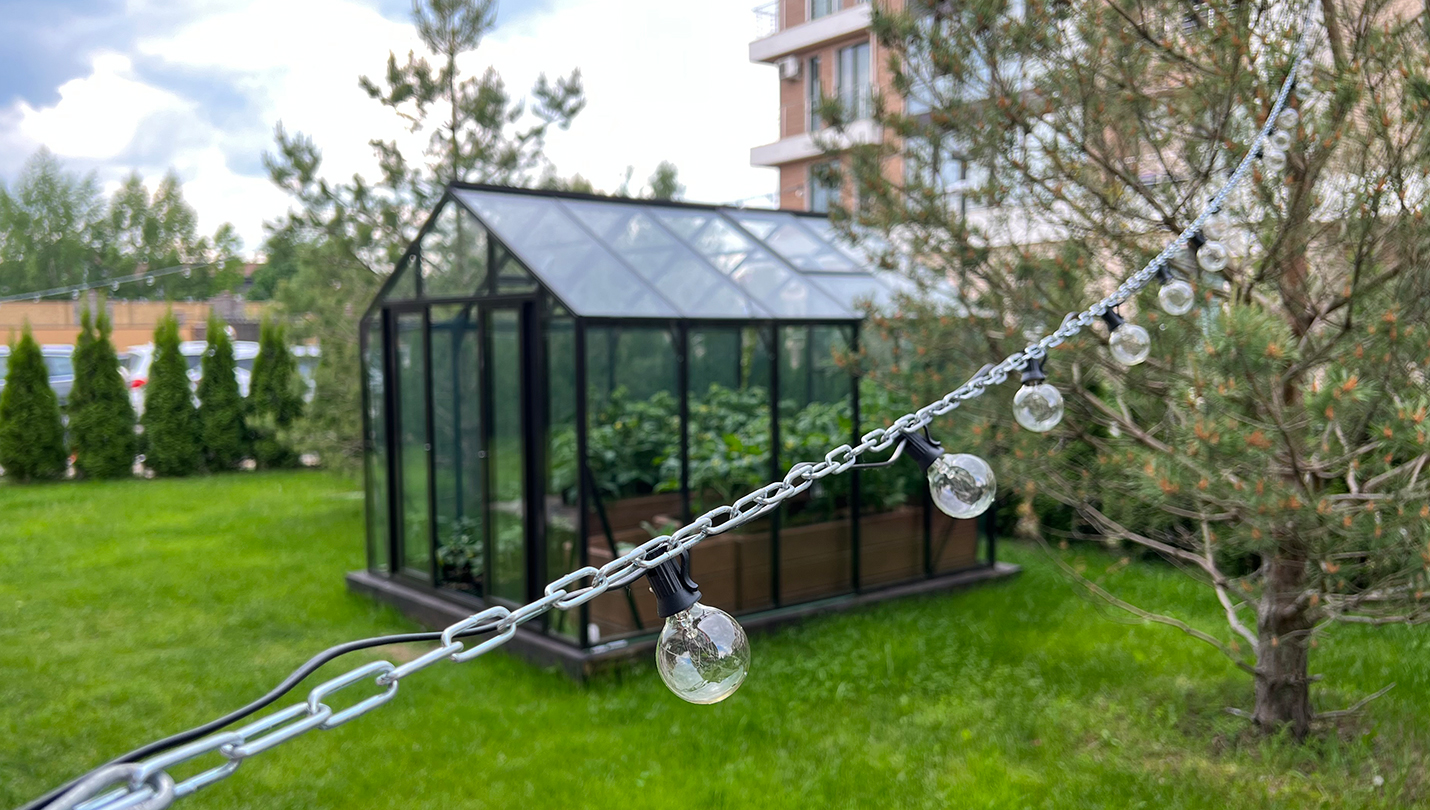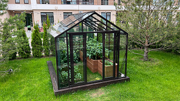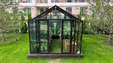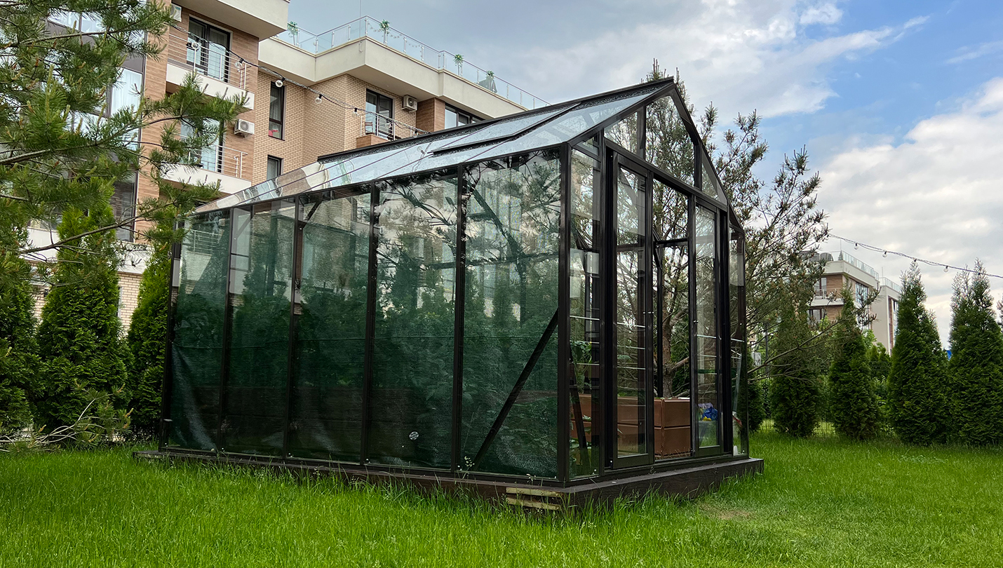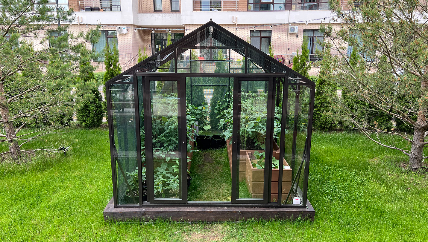 Решение для небольшого участка рядом с таунхаусом с акцентом на компактность и аккуратную интеграцию. Теплица органично вписывается в пространство, сохраняя лёгкость восприятия и создавая удобную зону для выращивания.